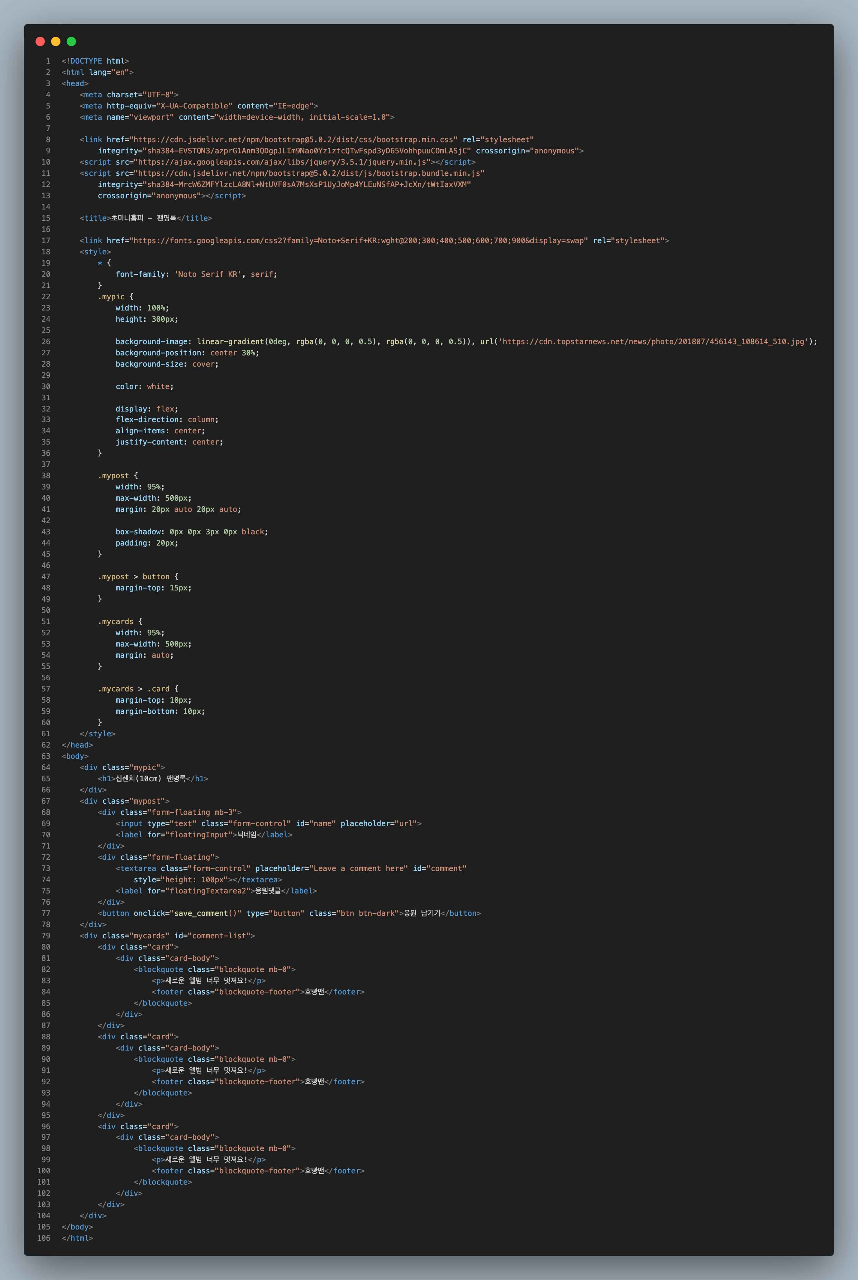 html, css, javascript로 간단한 페이지를 만들어 보았다. jquery와 bootstrap을 사용하면 빠르게 페이지를 만들수 있다는 것을 배웠다.